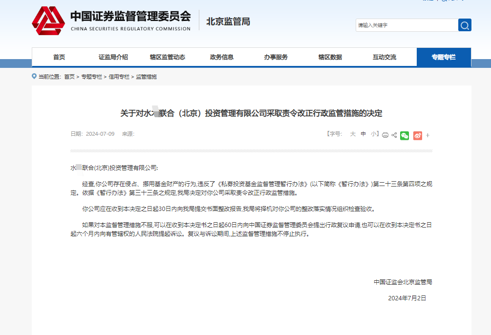 中基协备案信息显示,水X联合(北京)投资的管理规模0-5亿元,员工人数8人。实际上在7月1日,北京证监局还发布过一则行政监管措施决定。据悉,陈X进于2017年1月至2024年3月在水X联合(北京)投资管理有限公司担任法定代表人期间,存在侵占、挪用公司所管理的私募基金财产的行为,违反了相关规定,北京证监局决定对其采取责令改正行政监管措施。7月9日,四川证监局下发了对成都中X金控资产管理有限公司采取责令改正行政监管措施的决定,公司在开展私募投资基金业务过程中,首先是与关联方共用办公场所,合规风控负责人由关联方员工代为履职,未建立健全关联交易管理和从业人员投资申报、登记、审查、处置等管理制度,反映出公司未充分履行谨慎勤勉义务。其次是未对基金产品进行风险评级。第三是未按规定更新从业人员信息。浙江证监局近日下发关于对华X基金管理有限公司采取出具警示函措施的决定,华X基金在开展私募基金业务中存在以下行为,首先是未谨慎勤勉履行管理人职责,管理的部分基金未获取投资者的收入或资产证明,备案信息不真实、不准确。其次是将固有财产混同基金财产从事投资活动。第三是部分基金未按基金合同约定如实向投资者披露信息。上述行为违反了相关规定,公司被出具警示函。对此有业内人士表示,私募行业经过高速发展之后,随着监管日渐趋严,如今进入淘汰赛阶段,行业的出清必然加速。自去年以来,私募行业的出清在加速,尤其是2023年开年,1440多家私募被集体注销,除了被协会注销外,还有不少私募及高管还被处以警告、公开谴责等。(来源:私募帮帮龙)