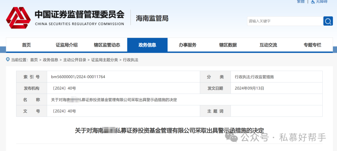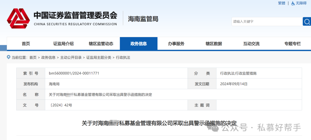 据海南证监局网站9月20日消息,近日,海南证监局对两家私募基金采取出具警示函措施的行政监管措施。