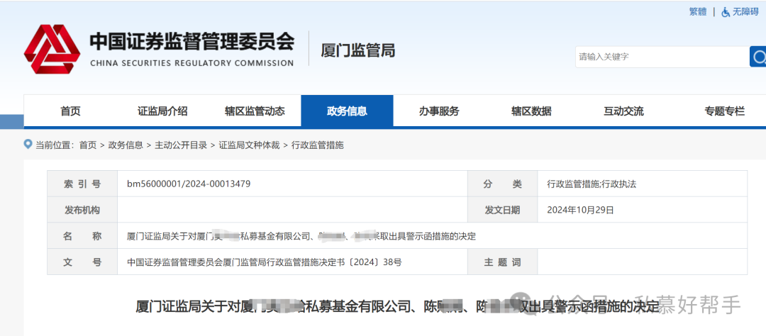 10月29日,厦门证监局发布一则行政监管措施决定书,对厦门奥**私募基金有限公司、陈**、陈*均出具警示函!
