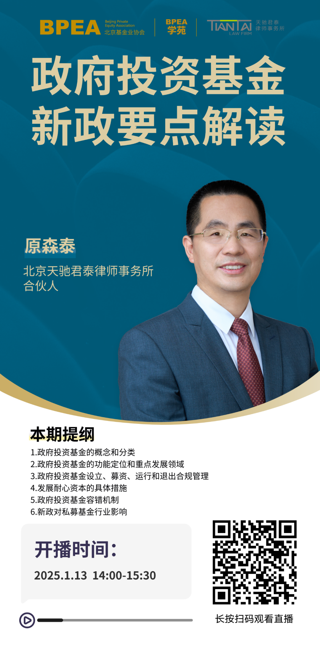 2025年1月7日,国务院办公厅印发《关于促进政府投资基金高质量发展的指导意见》,指导意见围绕政府投资基金设立、募资、运行、退出全流程,分7方面提出25条具体措施。指导意见明确政府投资基金是支持产业发展和科技创新的重要政策工具,成为首个国家层面促进政府投资基金发展的顶层设计文件。指导意见将为政府投资基金高质量发展,更好发挥政府投资基金功能,起到进一步的推进作用。本次分享,北京天驰君泰律师事务所合伙人原森泰律师为我们带来《政府投资基金新政要点解读》的主题分享,原律师将围绕政府投资基金功能定位、重点发展领域、规范运行与合规管理、新政对私募基金行业影响等方面对指导意见进行解读分析。